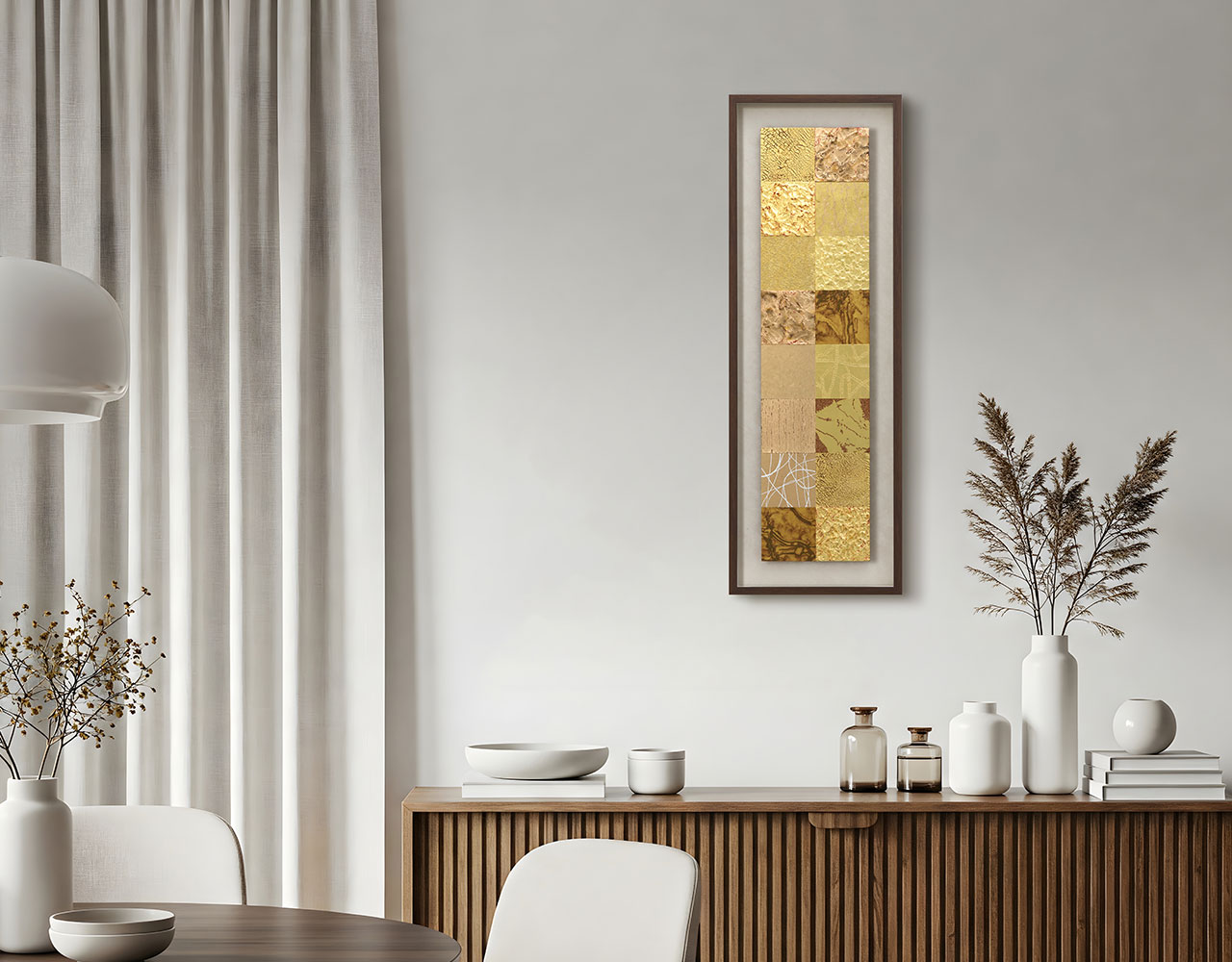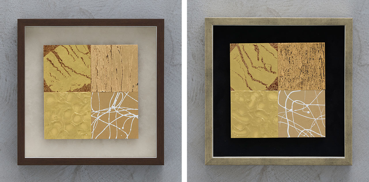 1ピース10㎝角のなかに、1つの世界観を表現するLUXEシリーズ。4ピースがセットになったのがSmallです。額の大きさ含めても30cmに収まります。マンションや狭小住宅など、コンパクトなスペースで暮らす人にもアートを楽しめるサイズです。金沢箔の存在感は抜群で、小さな面積でもその場の空気を華やかにしてくれます。また光の変化により輝き方が変わるため、一日を通じてお楽しみいただけます。